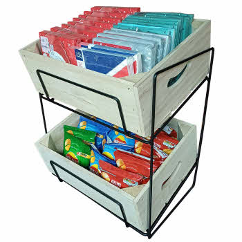 This 2 tier counter basket stand comes complete with two plain bushel style crates, which fit the wire frame perfectly.